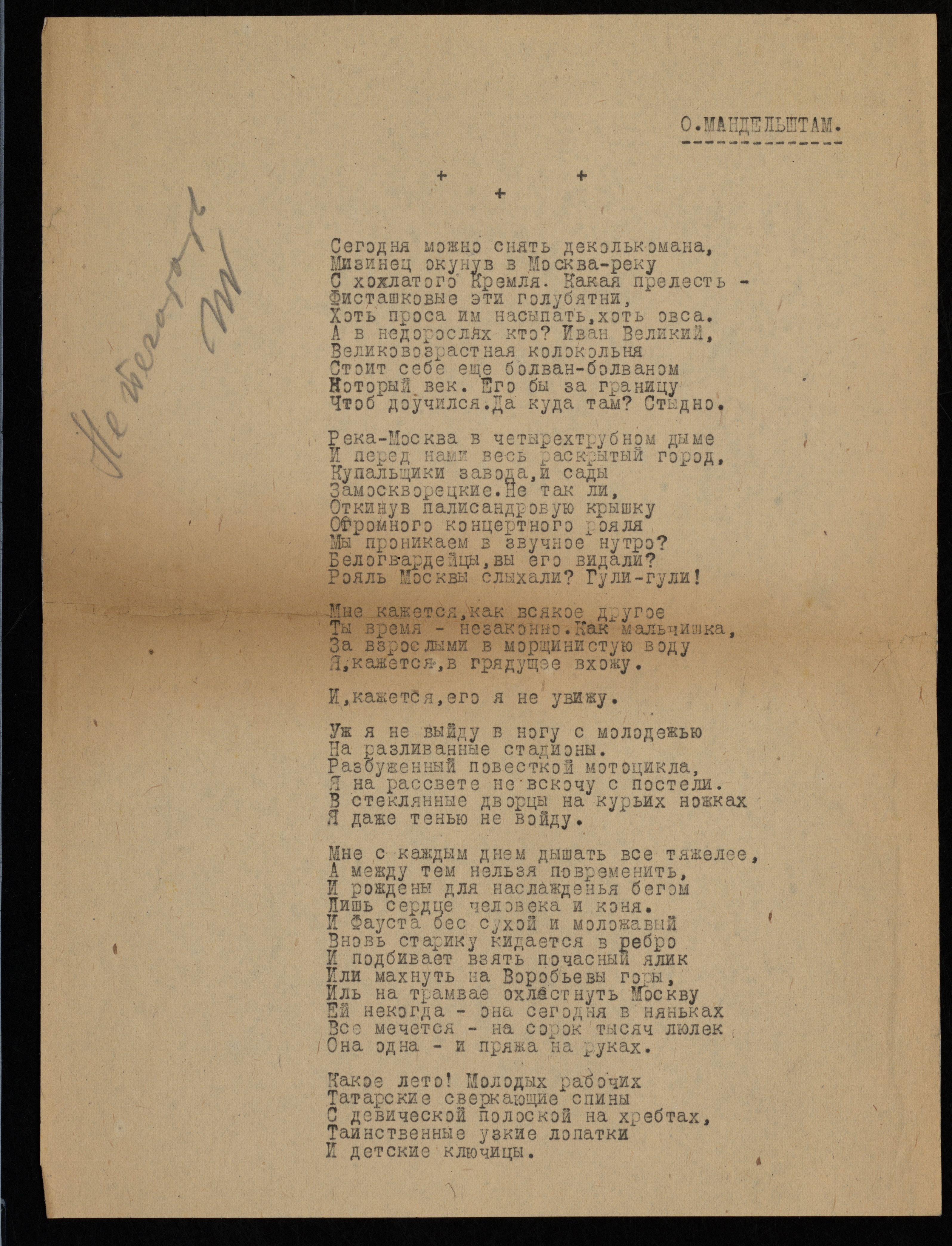 Фонды Морешет «Сегодня можно снять декалькомана...». Стихотворение На л. 1 слева помета С.Б. Ингулова: «Не печатать». Сюжет Литература, Книгоиздание Автор Мандельштам Осип Эмильевич Период создания [1931] Материал, техника Бумага, Машинопись, Автограф, Карандаш Размеры 28,9 х 21,7 см Правообладатель Государственный музей истории российской литературы имени В. И. Даля Номер в Госкаталоге 58159250 Входит в выставки Улица Мандельштама: Осип и Надежда