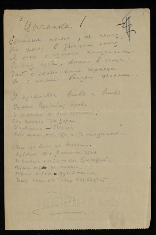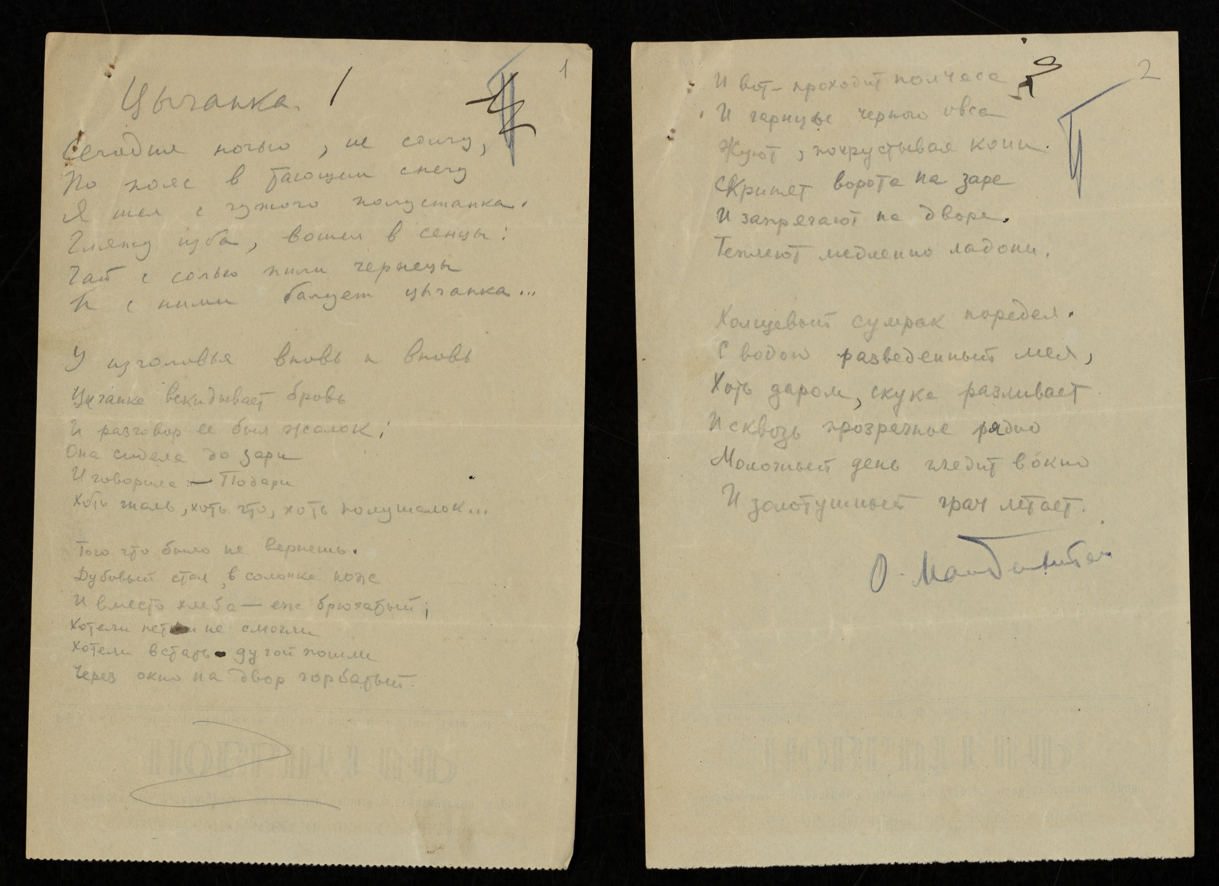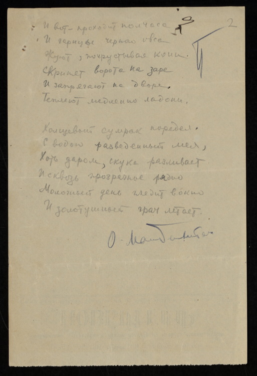 Фонды Морешет «Цыганка». Стихотворение На оборотах бланков журнала «Новый мир». Сюжет Литература, Книгоиздание Автор Мандельштам Осип Эмильевич Период создания [1927] Материал, техника Бумага, Карандаш синий, Автограф, Карандаш Размеры 20,5 х 13,6 см Правообладатель Государственный музей истории российской литературы имени В. И. Даля Номер в Госкаталоге 5484889 Входит в выставки Улица Мандельштама: Осип и Надежда
