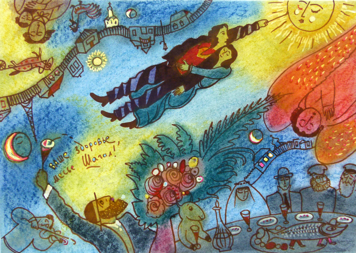 Фонды Морешет Ваше здоровье, месье Шагал! Автор Лепетухин Александр Петрович Период создания 2014 Материал, техника Бумага, Маркеры, Акварель, Пастель Размеры 35х50 Правообладатель Музей современного искусства Еврейской автономной области Входит в выставки От авангарда до наших дней