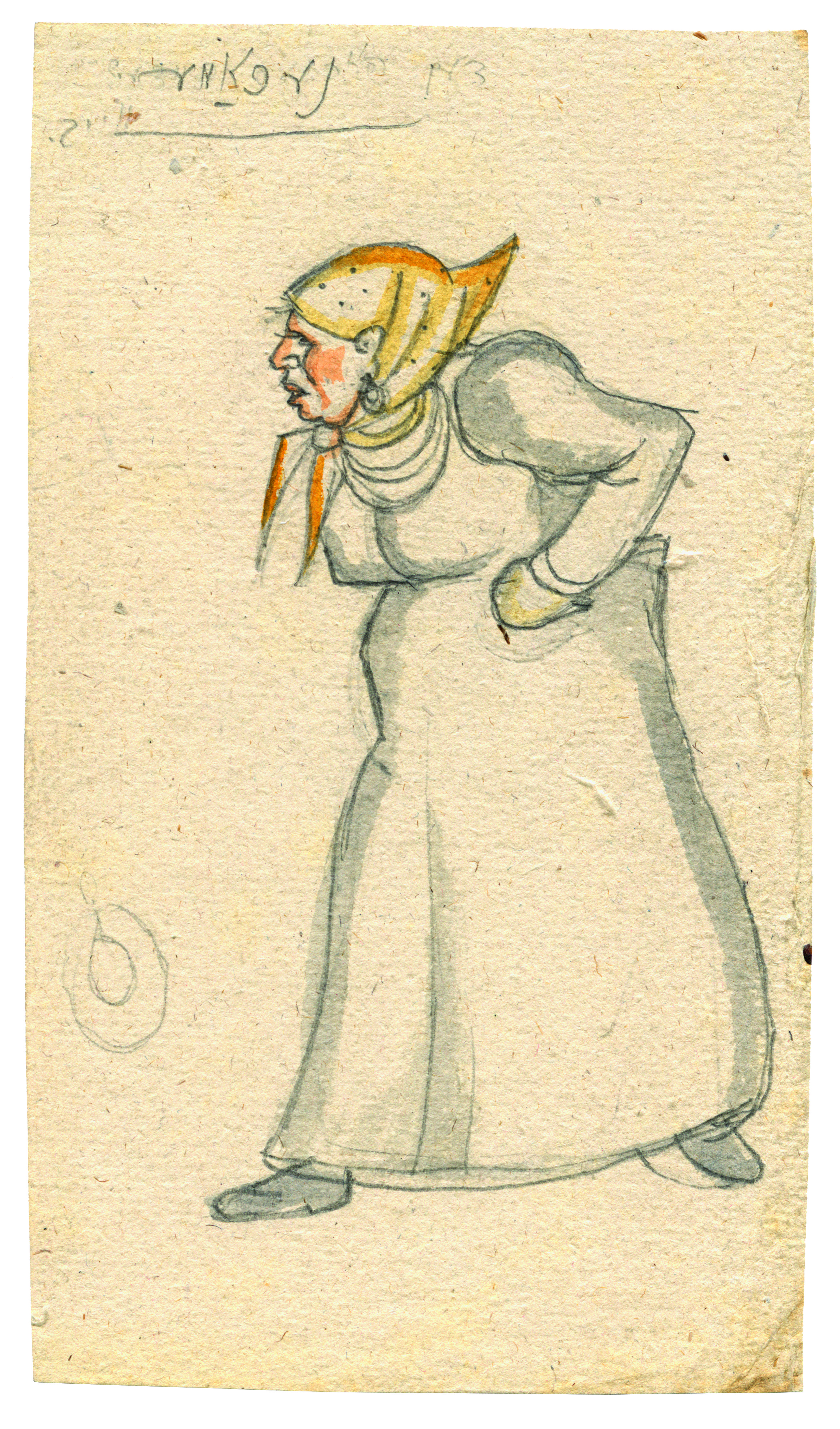 Фонды Морешет Нехама. Эскиз к спектаклю «Рекруты» (Театральная мастерская под руководством Л. И. Мурского при Евдомпросвете им. Я. Свердлова. Премьера в апреле 1934) Сюжет Изобразительное искусство, Традиция, Театр Автор Юдовин Соломон Период создания 1934 Материал, техника Бумага, Акварель, Карандаш Размеры 17,7 × 10,2 Правообладатель Собрание Еврейского общинного центра, Санкт-Петербург Входит в выставки Местечко на Фонтанке. От Шагала до современности