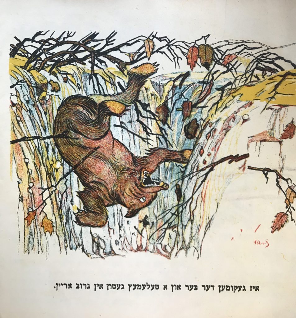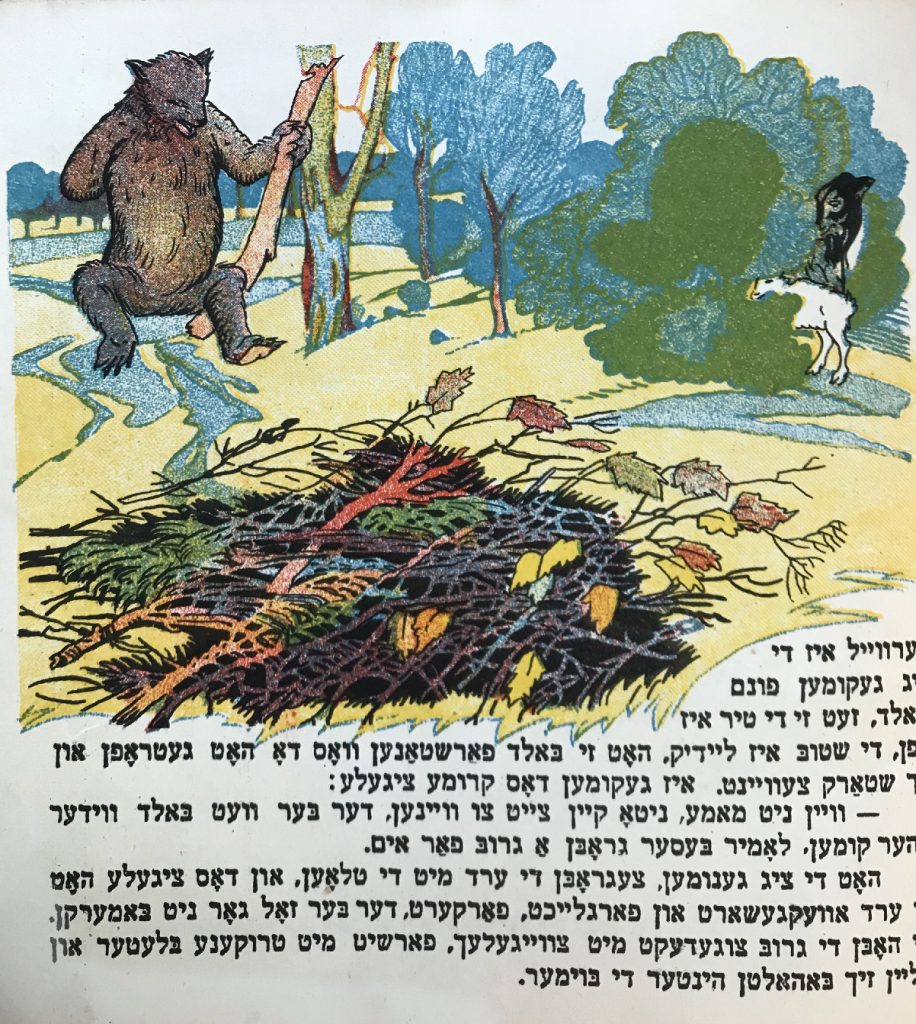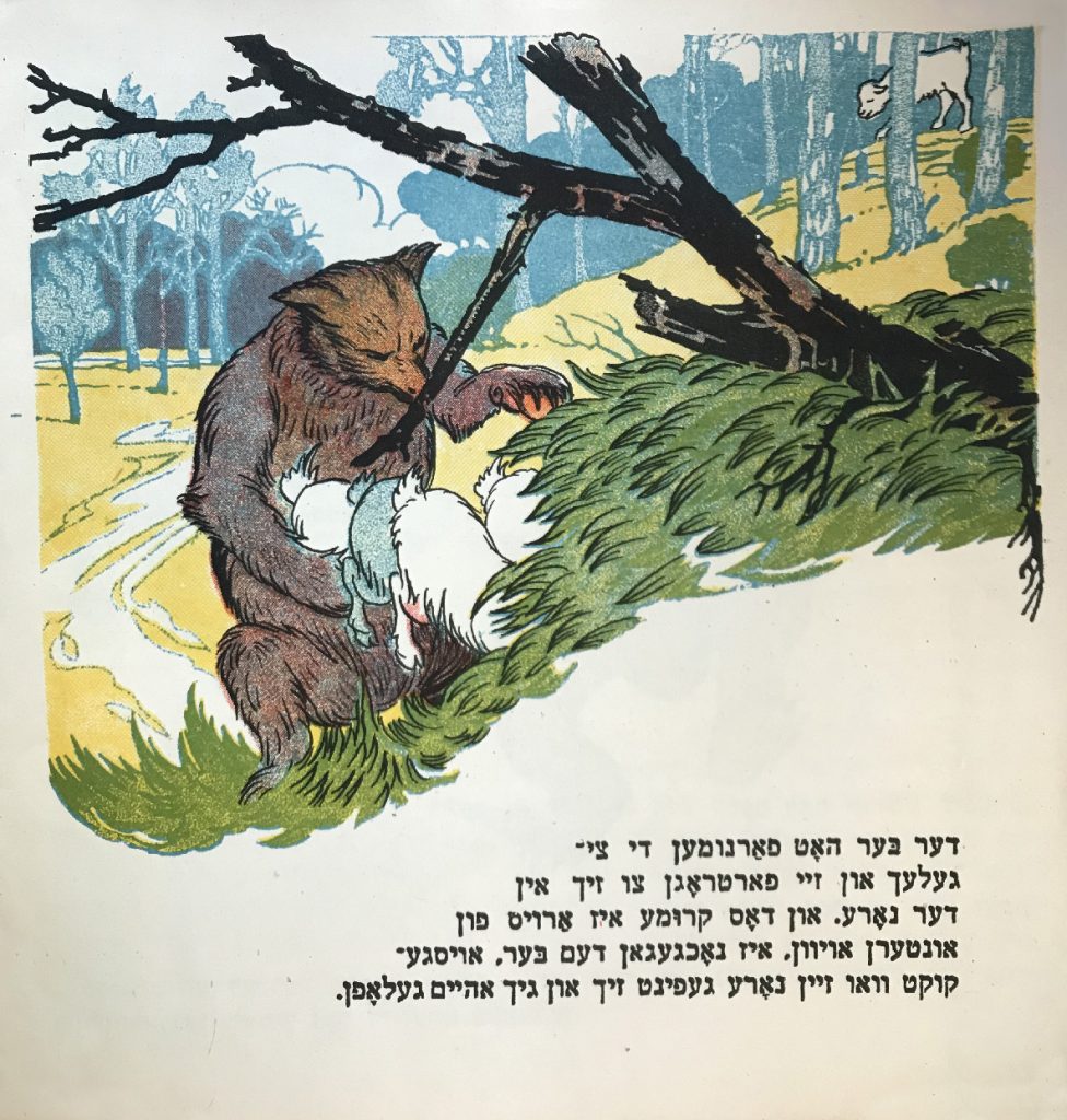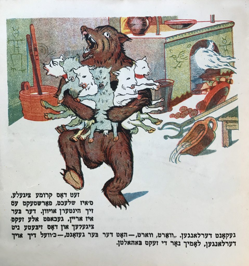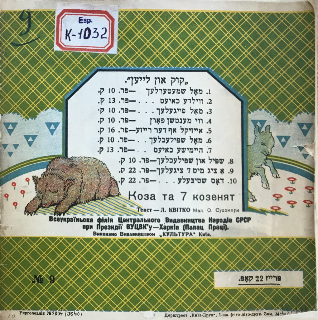 Выходные данные: Квитко Л. А циг мит зибн цигелех (Коза с семью козлятами). Художник О. Судомора. Харьков — Киев: Центрфарлаг – Культура, 1928