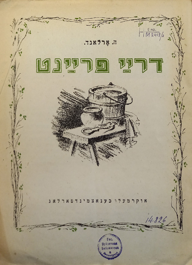 Фонды Морешет Герш Орланд. Три друга Выходные данные: Герш Орланд. Драй фрайнт (Три друга). Художник А. Каганер. Киев: Укргоснацмениздат, 1939 Автор Каганер А. Период создания 1939 Правообладатель Российская национальная библиотека, Санкт-Петербург, Ассоциация исследователей еврейской культуры «Петербургская иудаика» Входит в выставки Еврейская иллюстрированная книга в СССР. 1920-30-е годы