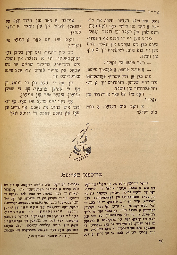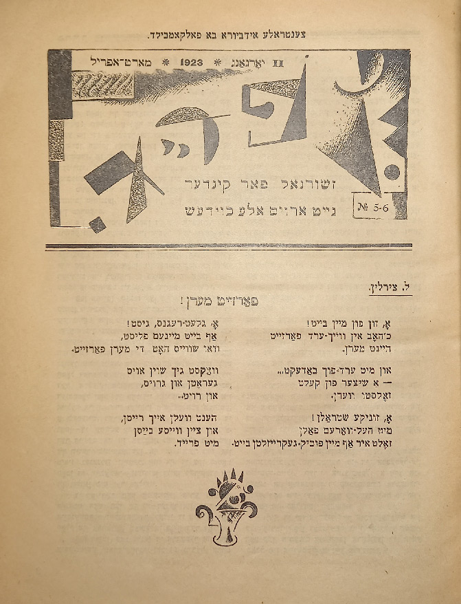Фонды Морешет Радость. Выпуск 5-6 Выходные данные: Фрейд (Радость). Киев: Культур-Лиге. Выпуск 5-6 (март-апрель 1923) Автор Эпштейн Марк Период создания 1923 Правообладатель Российская национальная библиотека, Санкт-Петербург, Ассоциация исследователей еврейской культуры «Петербургская иудаика» Входит в выставки Еврейская иллюстрированная книга в СССР. 1920-30-е годы