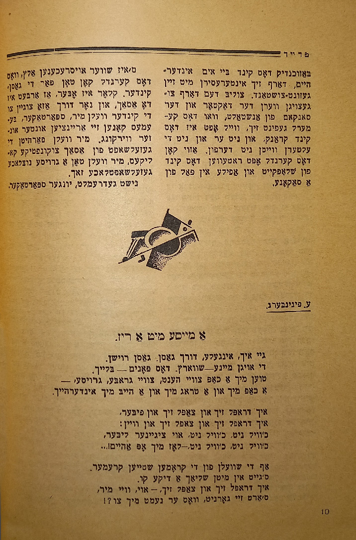 Фонды Морешет Радость. Выпуск 8 Выходные данные: Фрейд (Радость). Киев: Культур-Лиге. Выпуск 8 (июль 1923) Описание Выпуск содержит произведение «А майсе мит а риз (Сказка про великана)» Эзры Фининберга. Автор Эпштейн Марк Период создания 1923 Правообладатель Российская национальная библиотека, Санкт-Петербург, Ассоциация исследователей еврейской культуры «Петербургская иудаика» Входит в выставки Еврейская иллюстрированная книга в СССР. 1920-30-е годы
