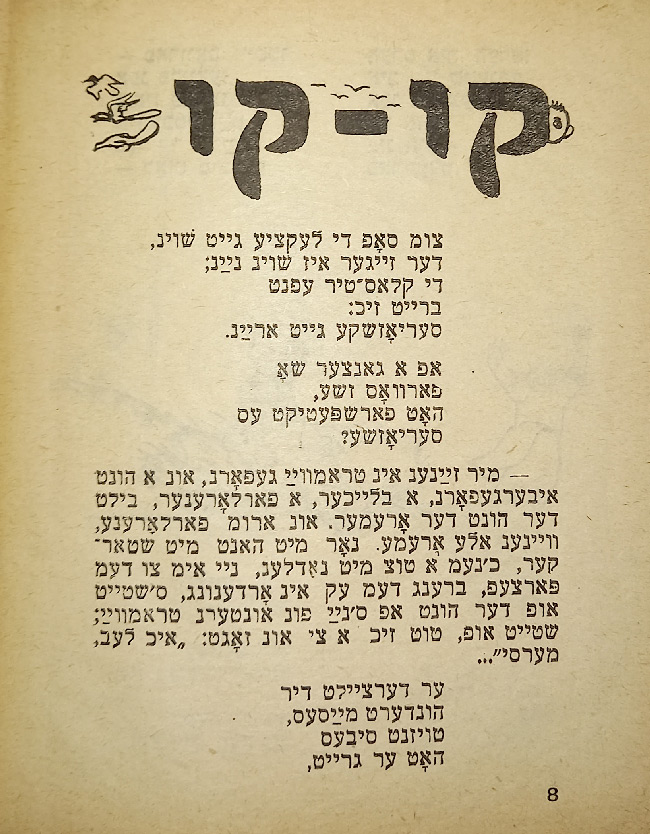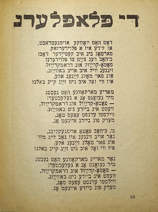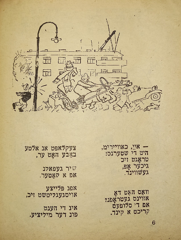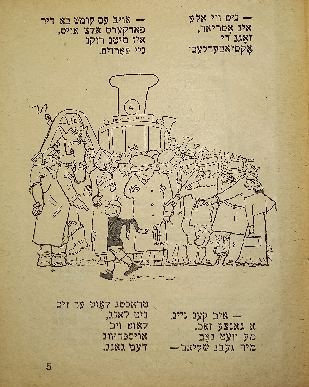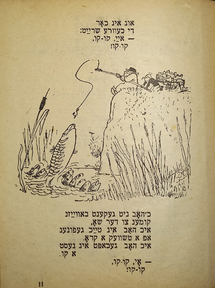 В стихотворении «Ингеле фаркерт (Мальчик наоборот)» слово «наоборот» написано вверх ногами. В сборник входят такие стихотворения, как «Ку-ку», «Их мит Тамарен (Мы с Тамарой)», «Плаплерн (Болтунья)».