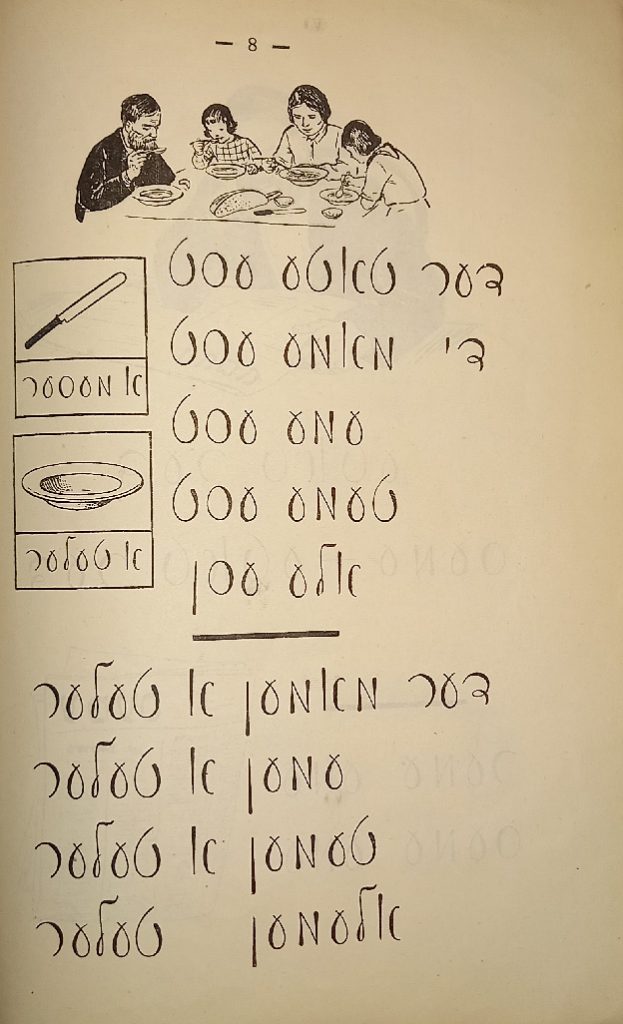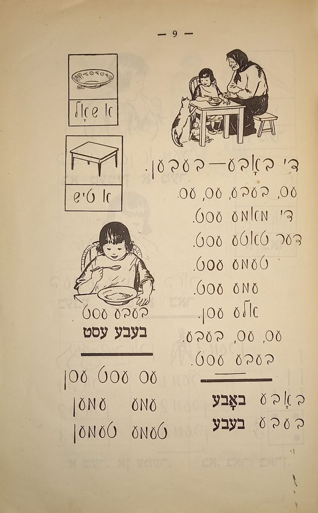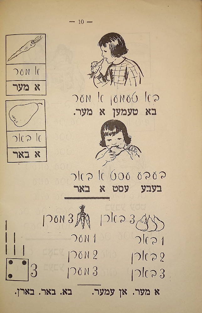 Выходные данные: Бакст И., Фридланд Н. Арбетс-киндер: Алефбейс (Дети труда: Букварь). Художник М. Муцельмахер. М.: Шул ун бух, 1927