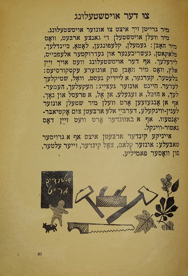 Фонды Морешет Эли Спивак. Играй и работай Выходные данные: Спивак Э. Шпил ун арбет (Играй и работай). Художник Н. Альтман. Киев: Культур-Лиге, 1928 Автор Альтман Натан Исаевич Период создания 1928 Правообладатель Российская национальная библиотека, Санкт-Петербург, Ассоциация исследователей еврейской культуры «Петербургская иудаика» Входит в выставки Еврейская иллюстрированная книга в СССР. 1920-30-е годы